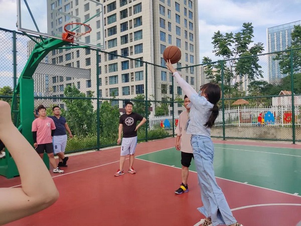 選手們手捧籃球,目盯籃筐,屏息吸氣,全力投籃,雖然不能百投百中,但大家都相互喝彩、鼓勵。